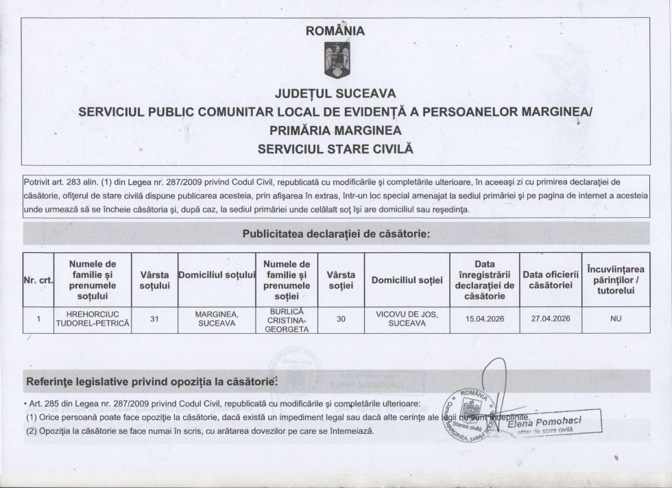 - Publicatie casatorie – 14 iulie 2025 (doc1, doc2)